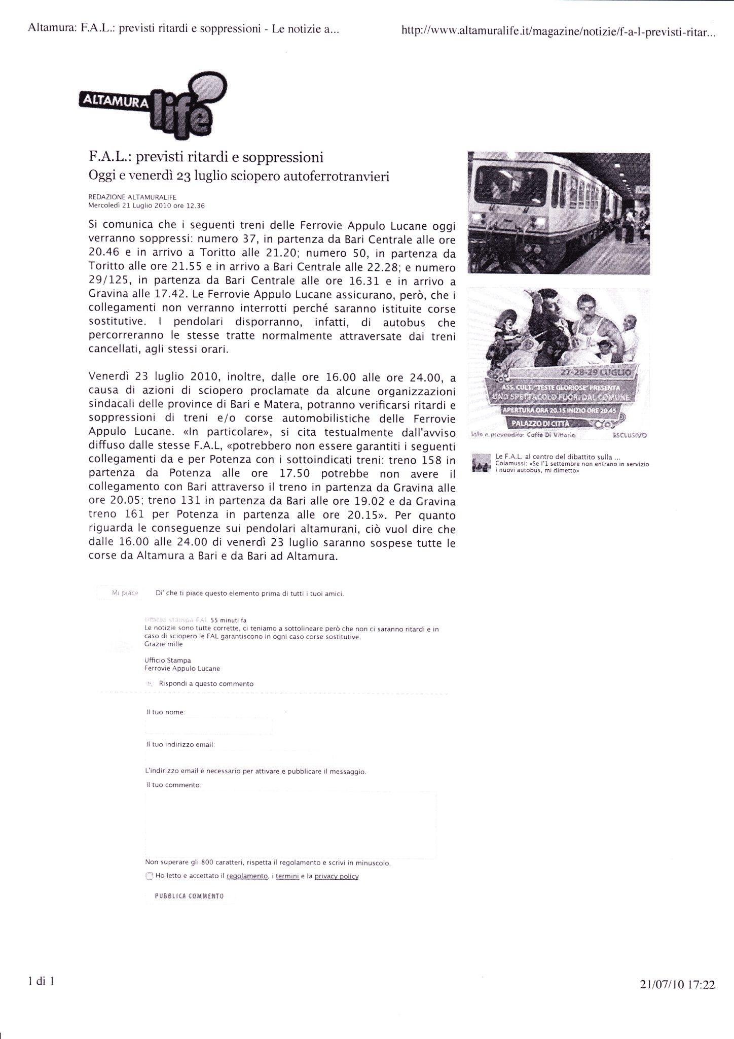 Ferrovie Appulo Lucane > Rassegne stampa > F.A.L.: previsti ritardi e soppressioni Oggi e venerdì 23 luglio sciopero autoferrotranvieri