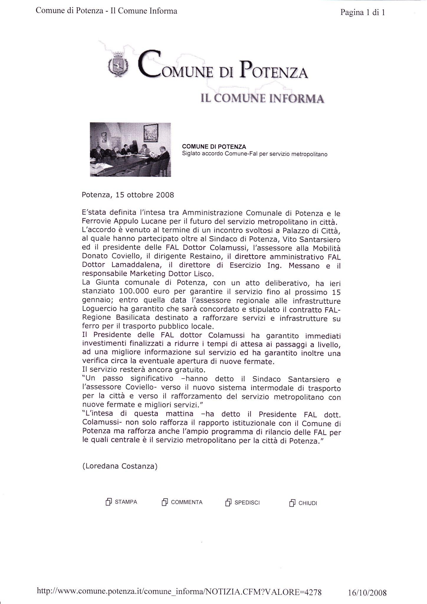 Ferrovie Appulo Lucane > Rassegne stampa > Comune di Potenza