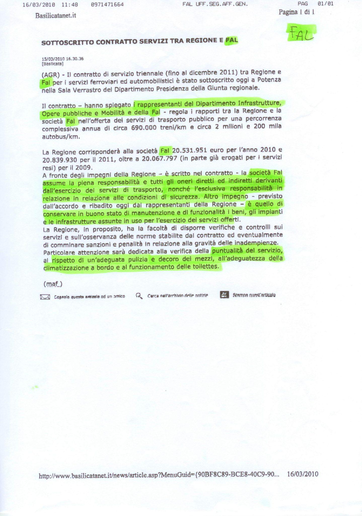 Ferrovie Appulo Lucane > Rassegne stampa > Sottoscritto contratto servizi tra Regione e Fal