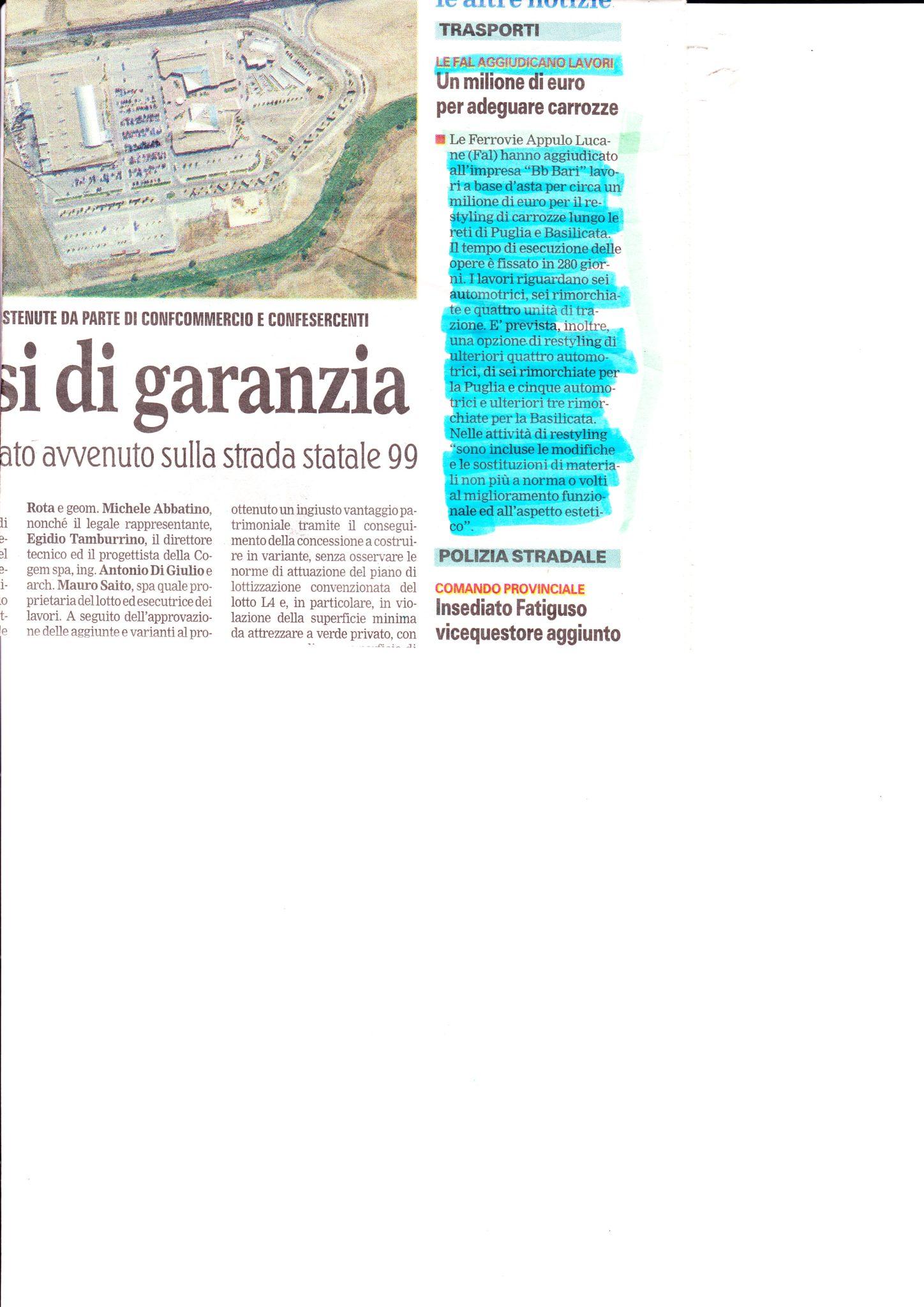 Ferrovie Appulo Lucane > Rassegne stampa > Un milione di euro per adeguare carrozze