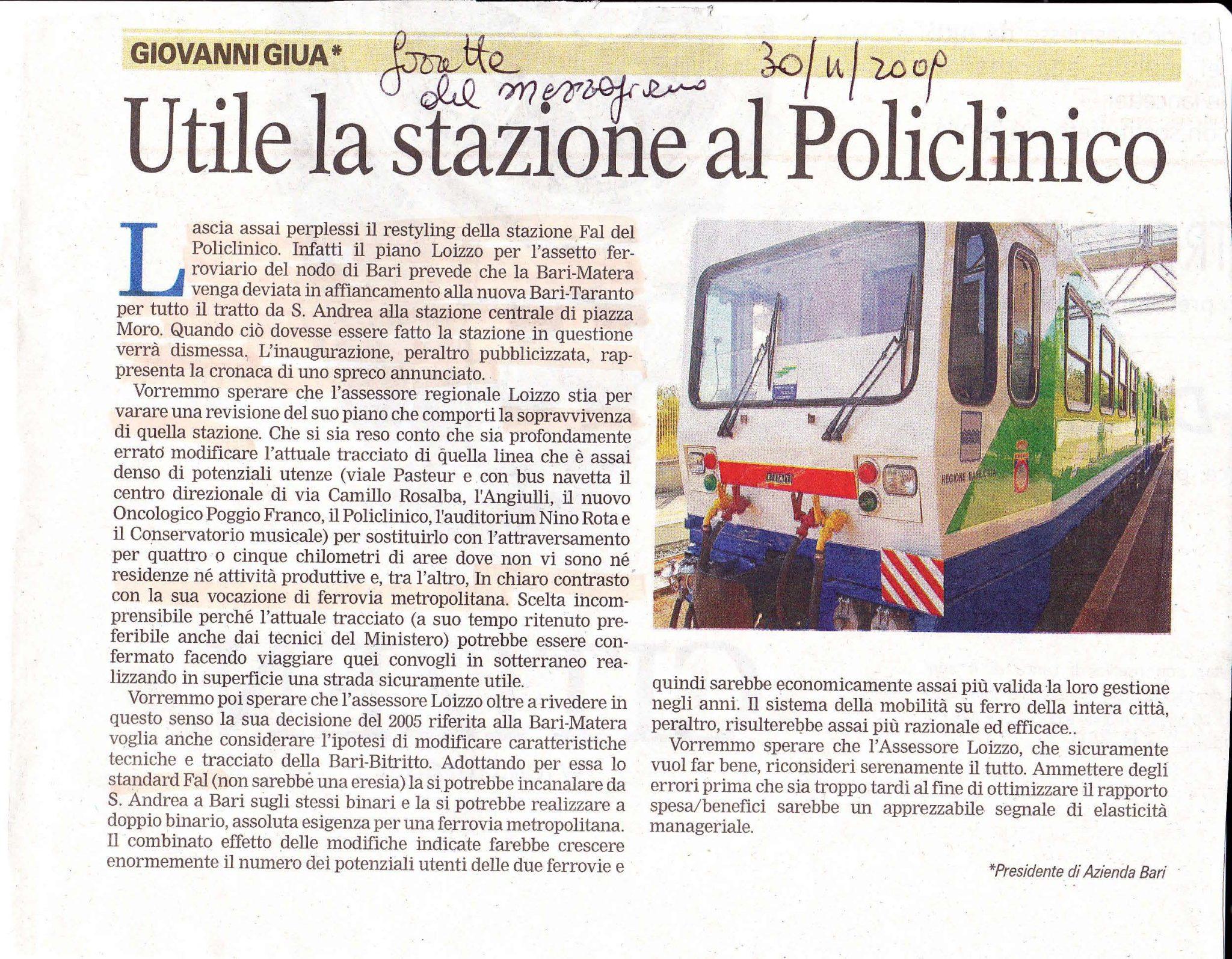 Ferrovie Appulo Lucane > Rassegne stampa > Utile la stazione al Policlinico